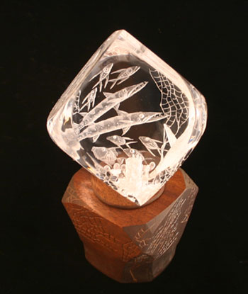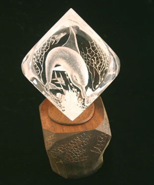 Revolving Seaworlds on Carved Buttonwood or Mahogany Base Each sculpture rotates to view three different scenes. 4" cube $1,000.00 3" cube $275.00 For Information about custom designs e-mail